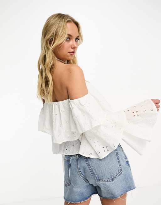 White bardot hot sale ruffle top