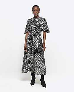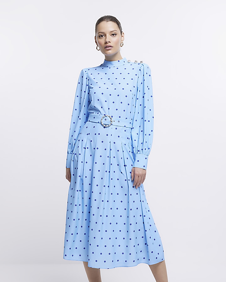 River island blue belted midi hot sale denim dress