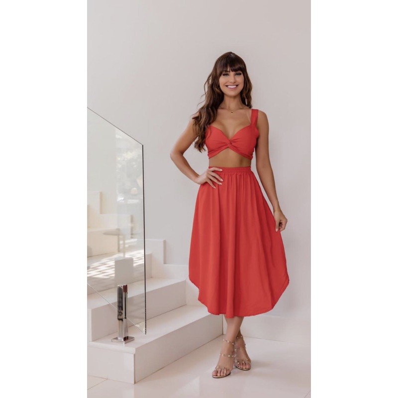 Cropped com hot sale saia midi rodada